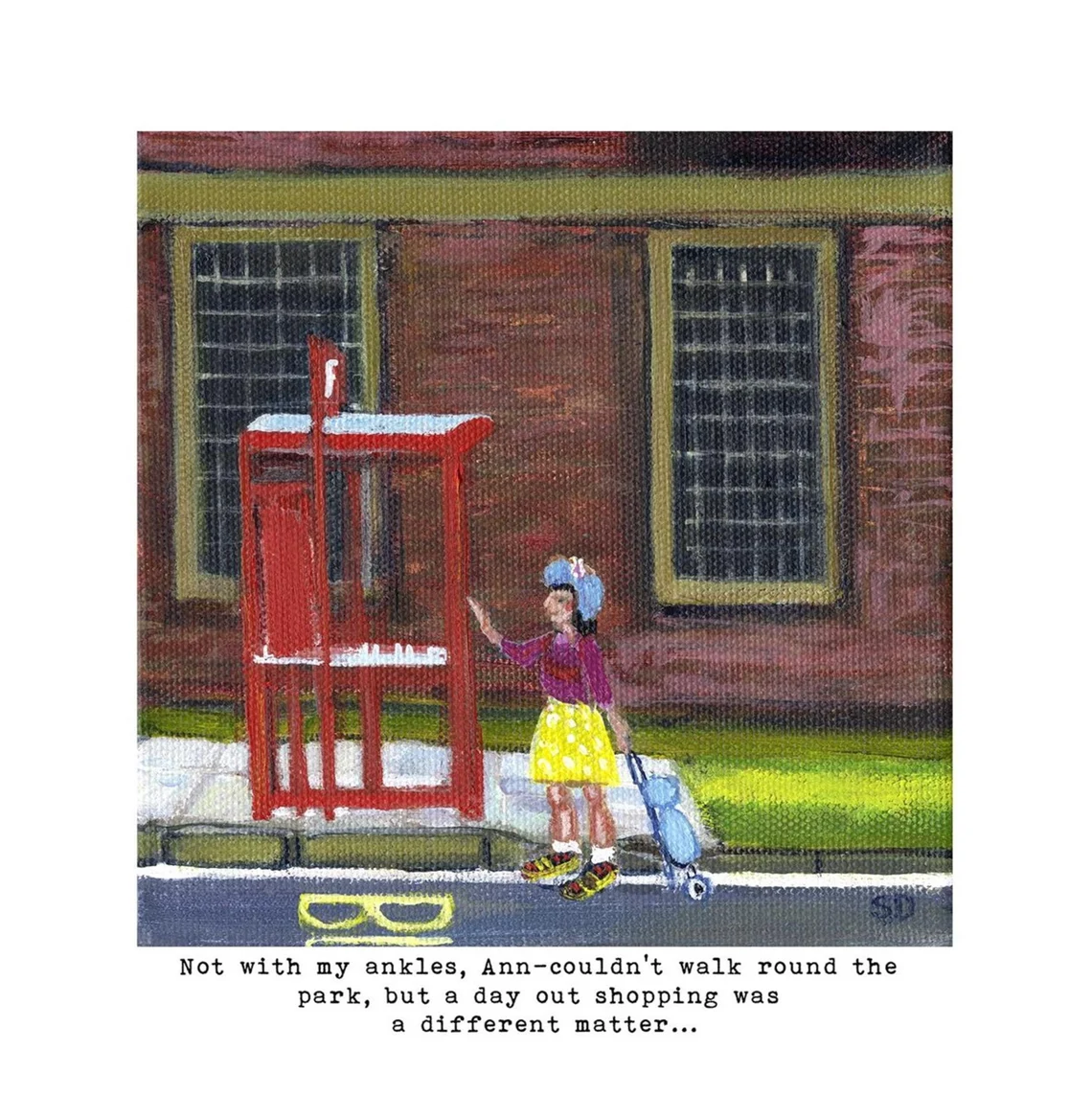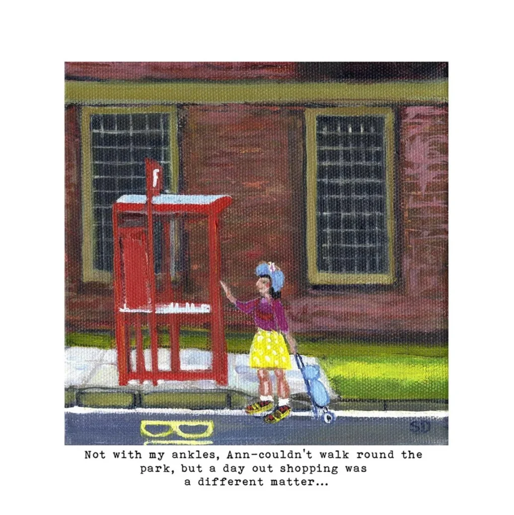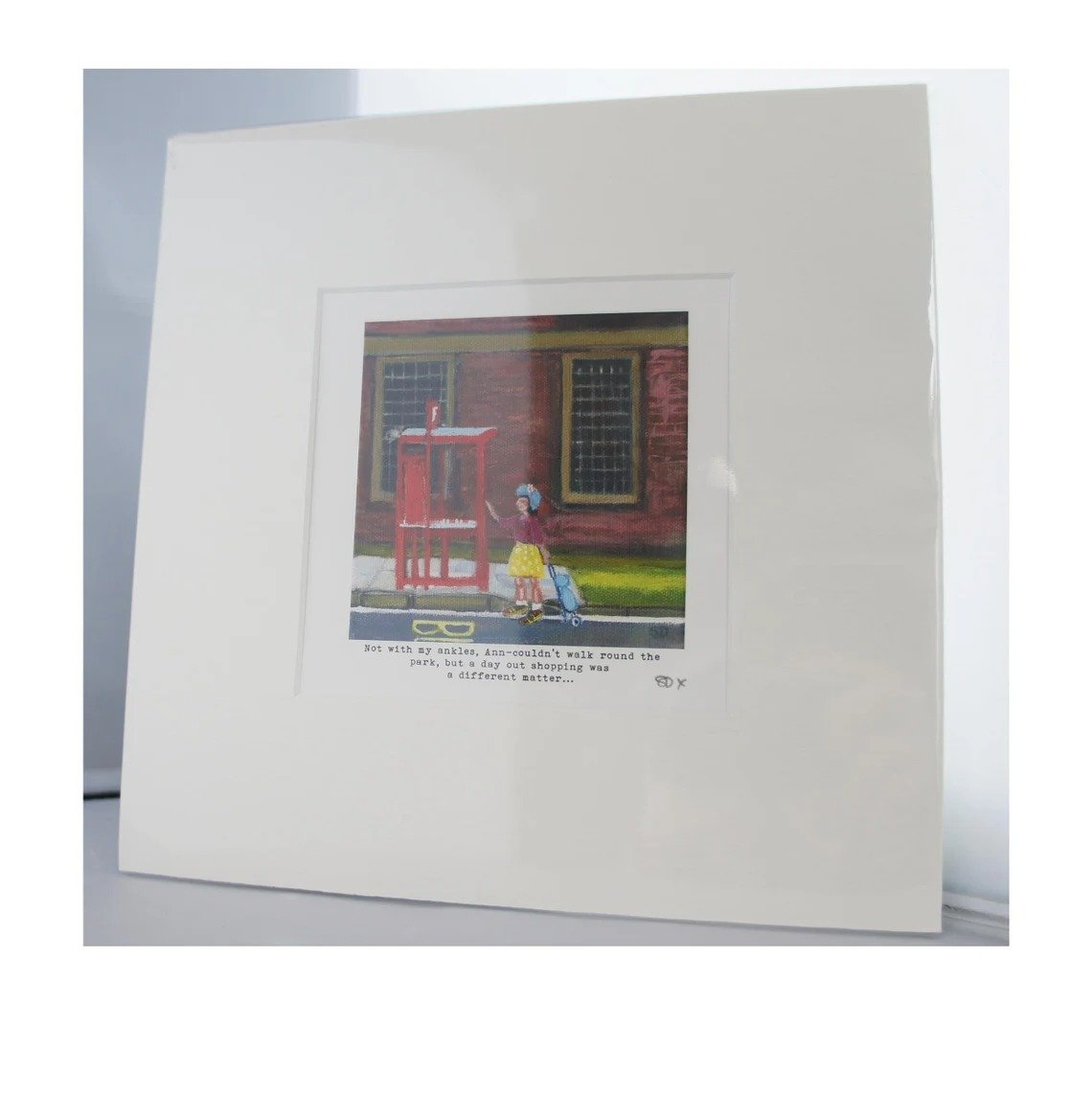 Art print of Ann – with caption Not with my ankles, Ann-couldn’t walk round the park, but a day out shopping was a different matter. One of my Owd lasses series of humorous old women.