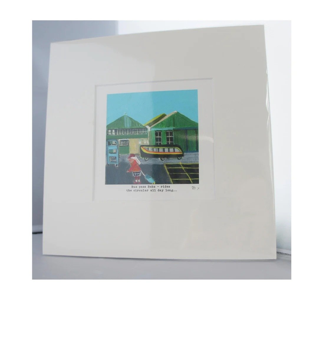Art print open edition of one of the Owd Lasses – Bus pass Babs – rides the circular all day long… little funny stories.Image is 10 cms x 10 cms with a cream mount around it ready to frame.