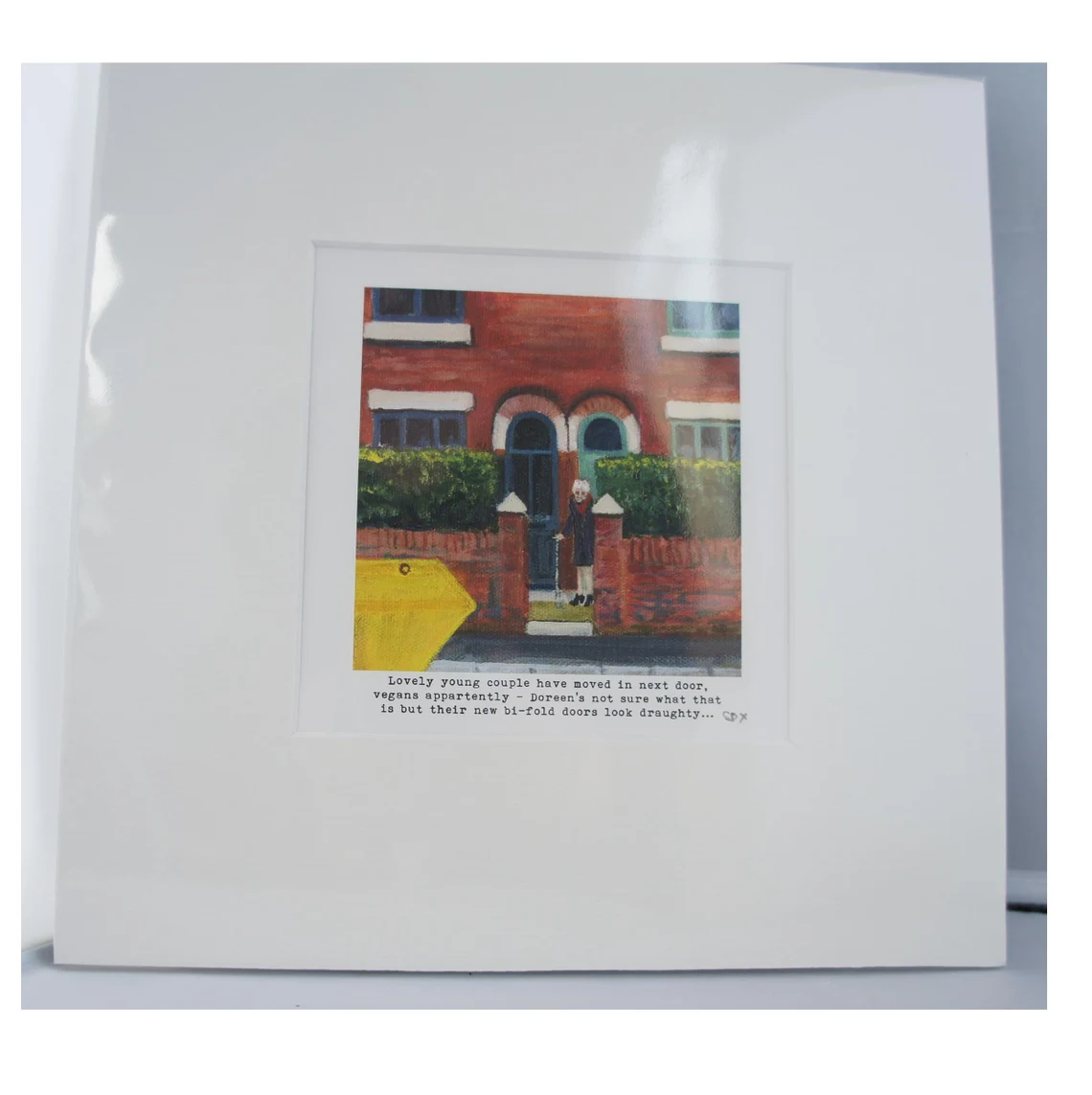 Art print – open edition of Doreen with funny caption on the bottom ‘ Lovely young couple moved in next door, vegans apparently – Doreen’s not sure what that is but their bi-fold doors look draughty…