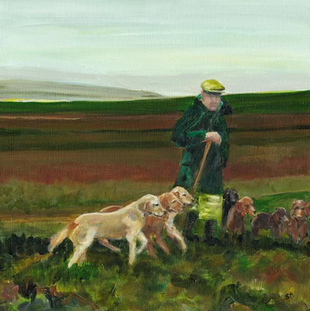 A ltd ed Giclee, signed print, mounted in a cream mount ready to put in a frame, On The Moors was inspired after a drive through Arkengarthdale when I spied a country gent exercising his dogs in the rain.