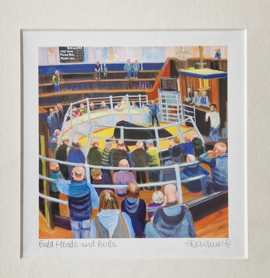 Bald Heads and Bulls 30cms x 30cmx (total mount size) mounted in a cream mount and ready for you to frame, giclee print of this iconic livestock auction scene. You can smell the banter, sawdust and hear the unfathomable chant of the auctioneer.