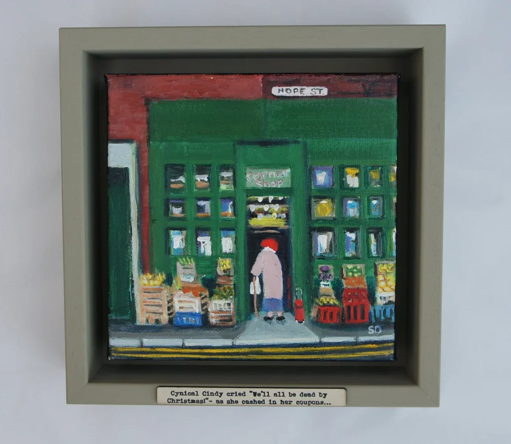 Original painting of Cynical Cindy one of my Owd Lasses. Title tag on bottom of frame reads ‘Cynical Cindy cried ”We’ll all be dead by Christmas” – as she cashed in her coupons…