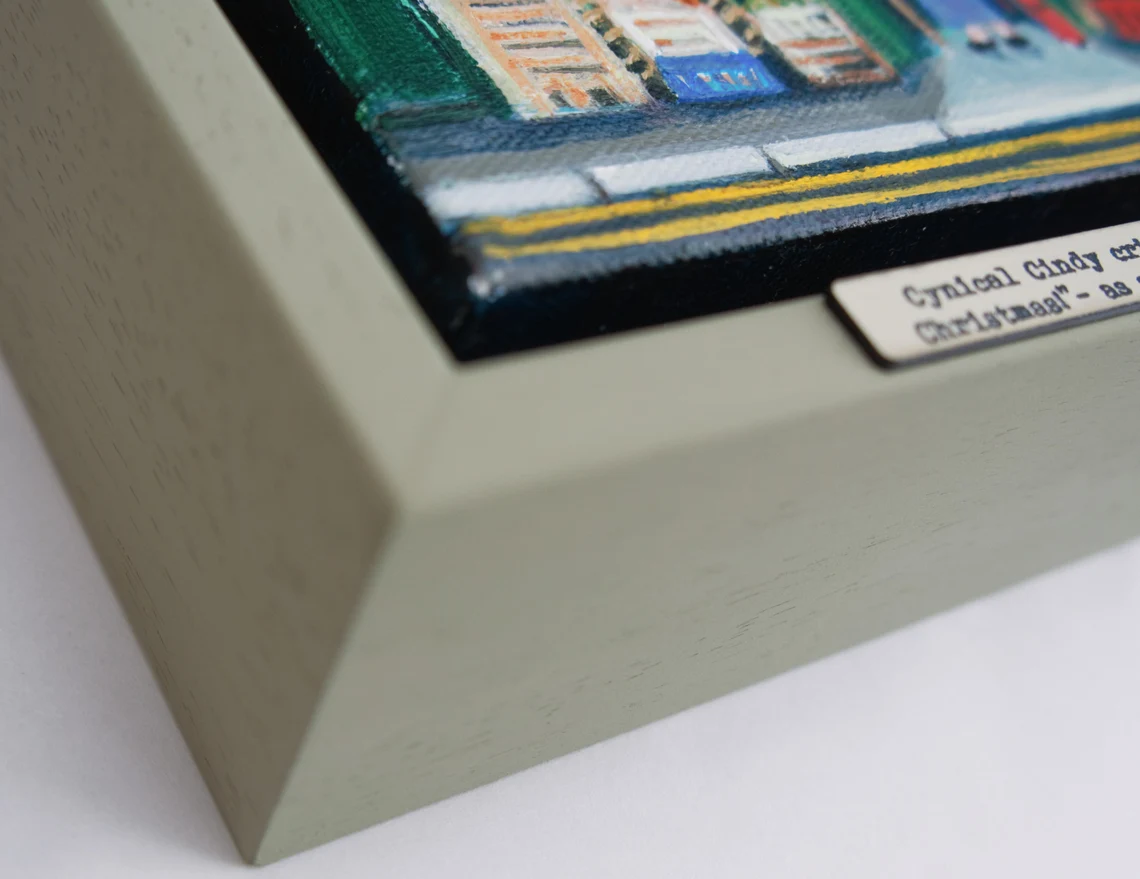 The acrylic on canvas is framed in a hand painted grey/green floating, chunky frame which measures 19.5 cms square and is strung and ready to hang on the wall.