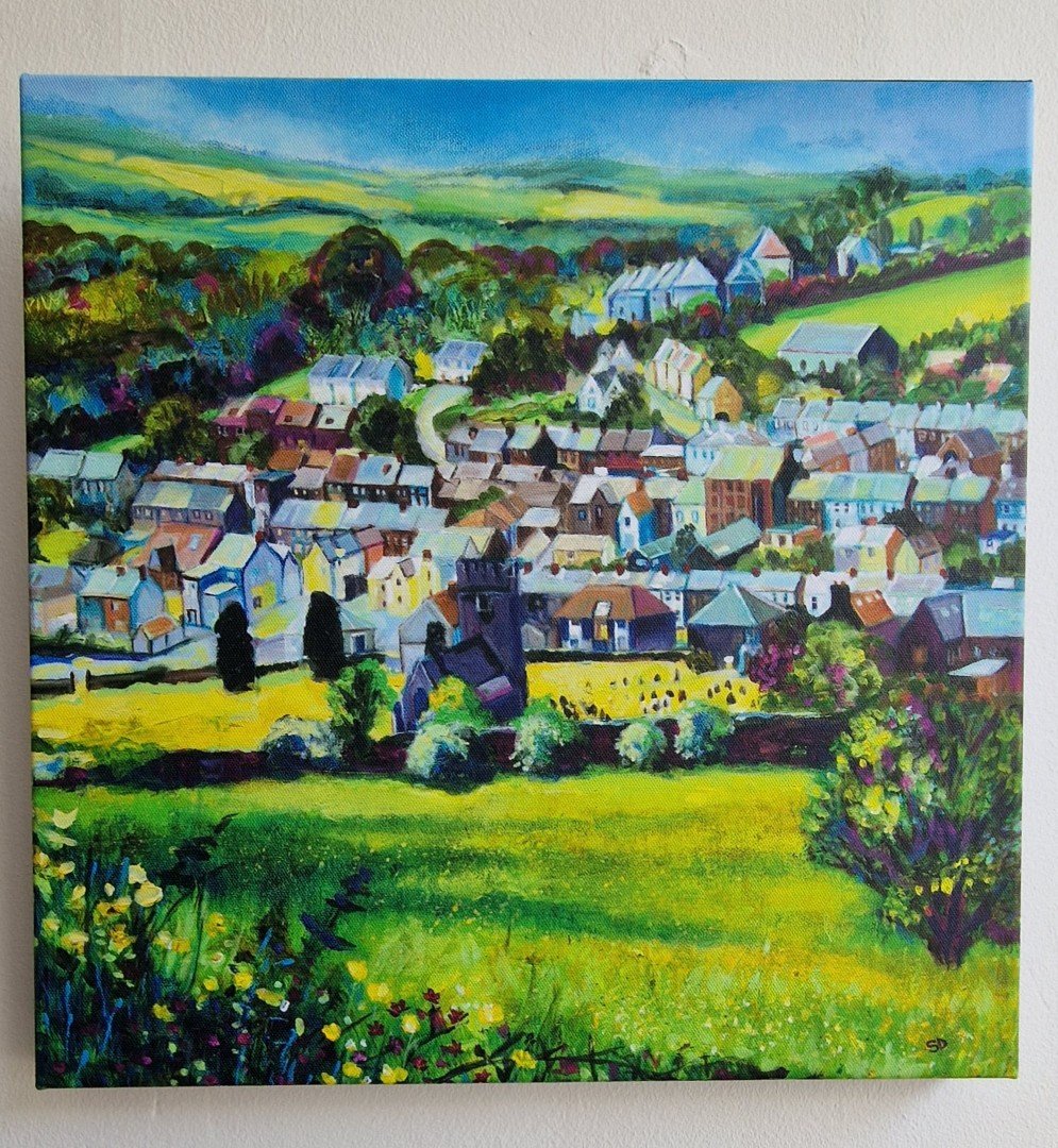 Llandysul Summer a print on boxed canvas measuring 16” x 16 ” with purple edges, ready to hang on your wall. Image is printed from the original painting,  capturing the hazy Summer light bouncing off the rooftops of this interesting town in Ceredigion.