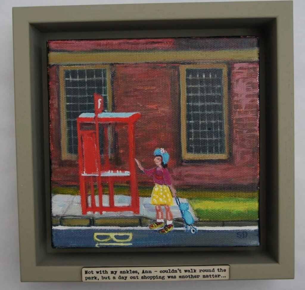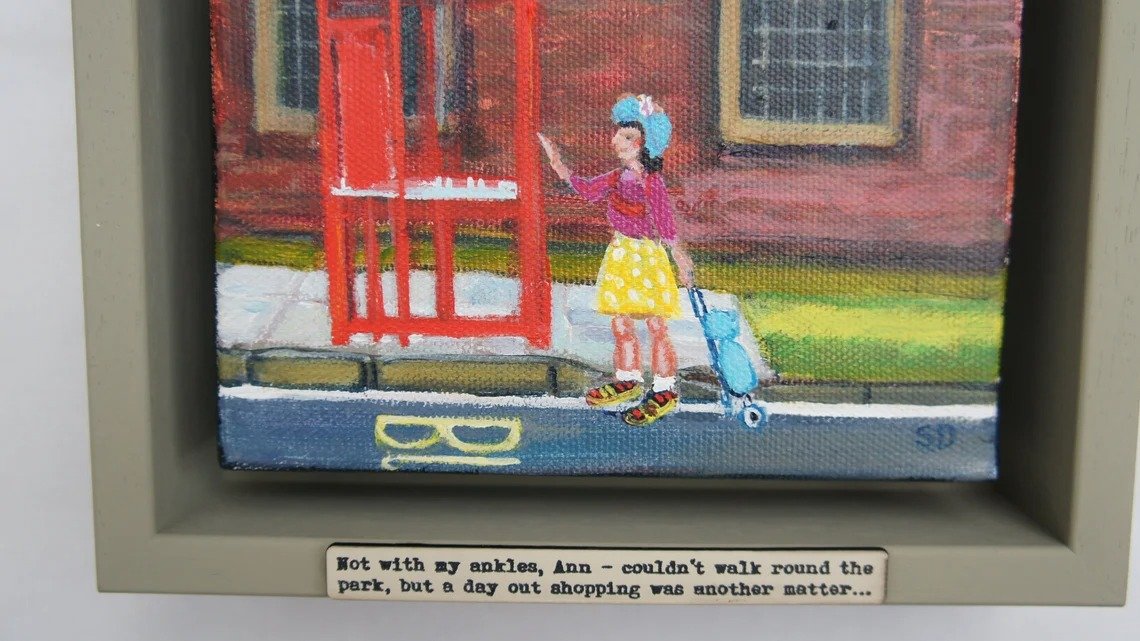 Original painting of Ann, framed in a hand-painted chunky shadow frame with caption ‘Not with my ankles, Ann – couldn’t walk round the park, but a day out shopping was another matter…’