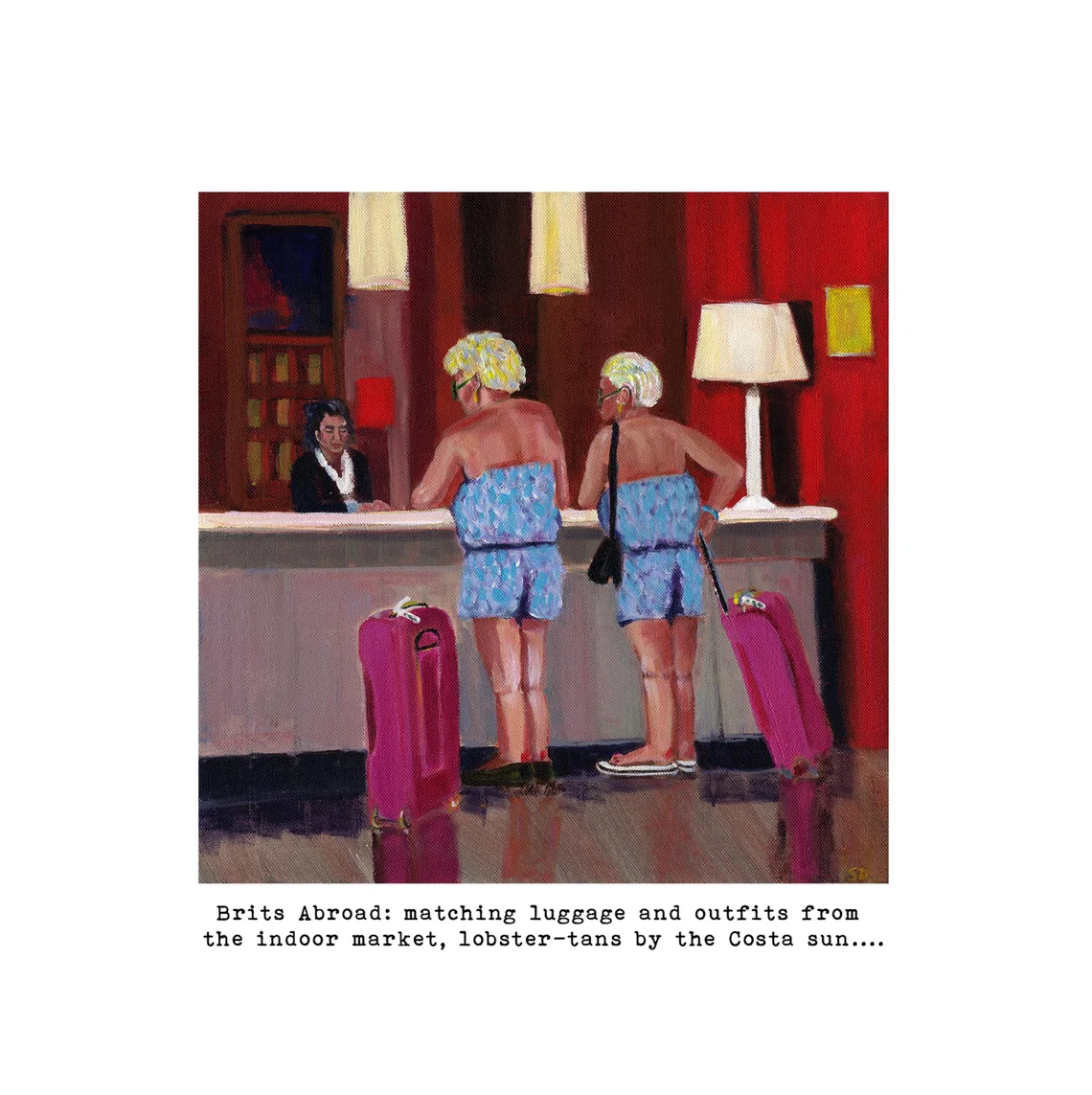 A signed giclee print of one of my Owd Lasses collection ‘Brits Abroad” shows two best amtes on holiday with matching outfits and luggage, sunburnt from the Costa sun checking out of the hotel in the lobby. The actual image measures 10cm x 10 cms and it is ready to frame in a 25cms x 25 cms frame mounted in a cream mount.