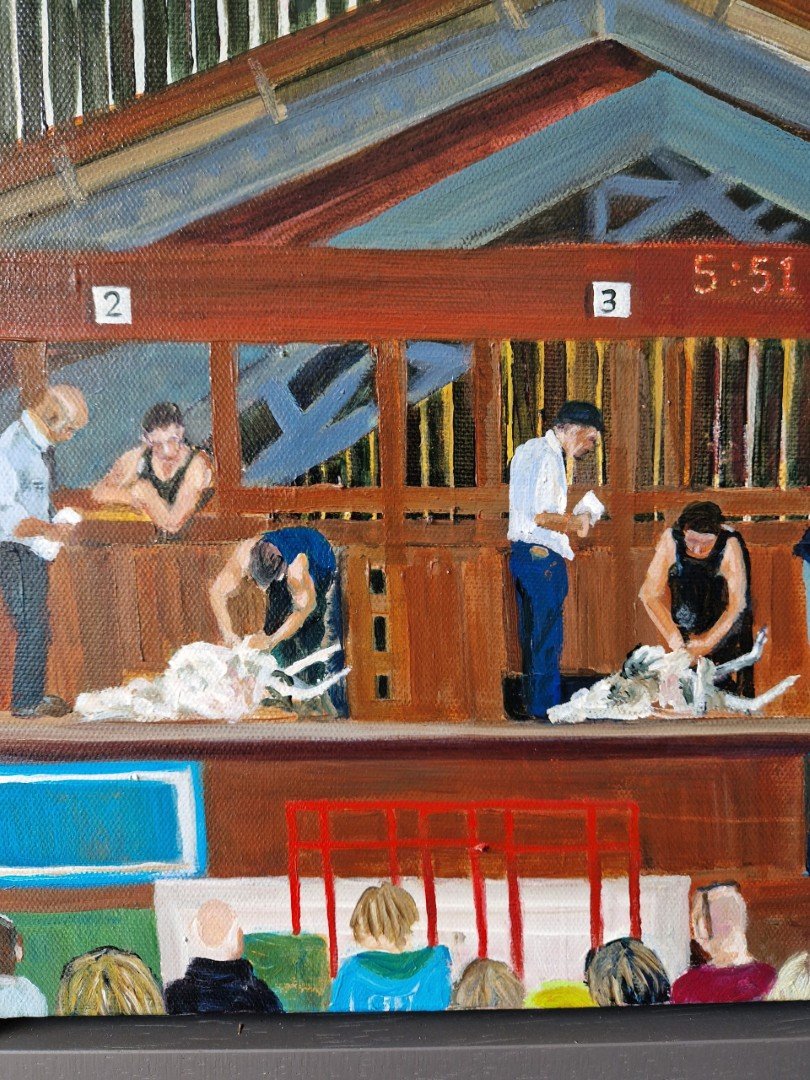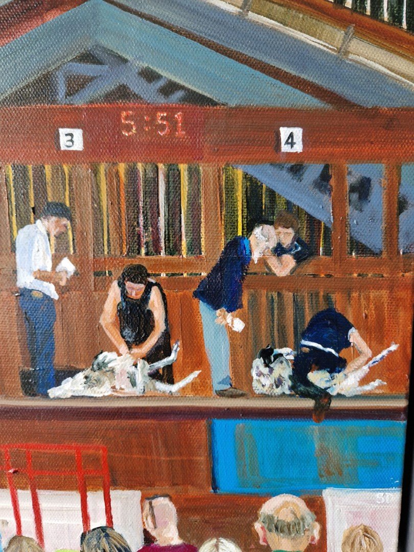A painting of a shearing competition at a country show. I love capturing the farming calendar and these competitions are ferocious, fast and furious. Skills handed down through generations.