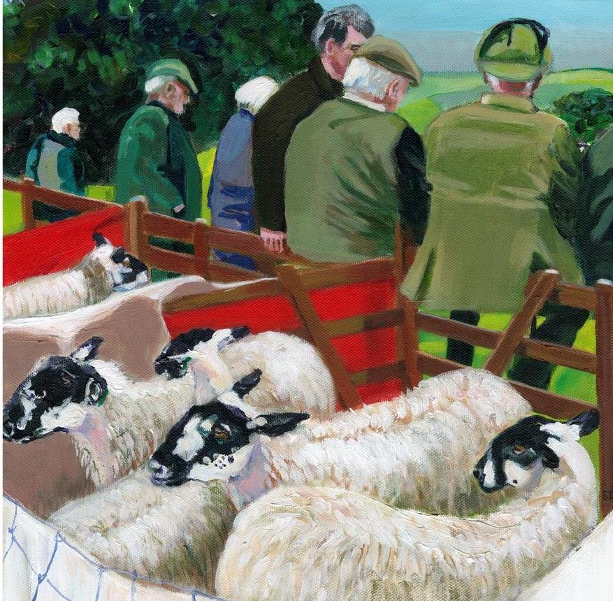 Ltd. ed. Giclee print of Showtime taken from my original painting of a typical country fair all the farmers are gathering to show their stock, after a hard year they do their best to win prizes to increase the value of their sheep. The sheep are waiting patiently to be judged. This may seem like a quaint tradition but it has far reaching consequences  for the small scale farming industry.