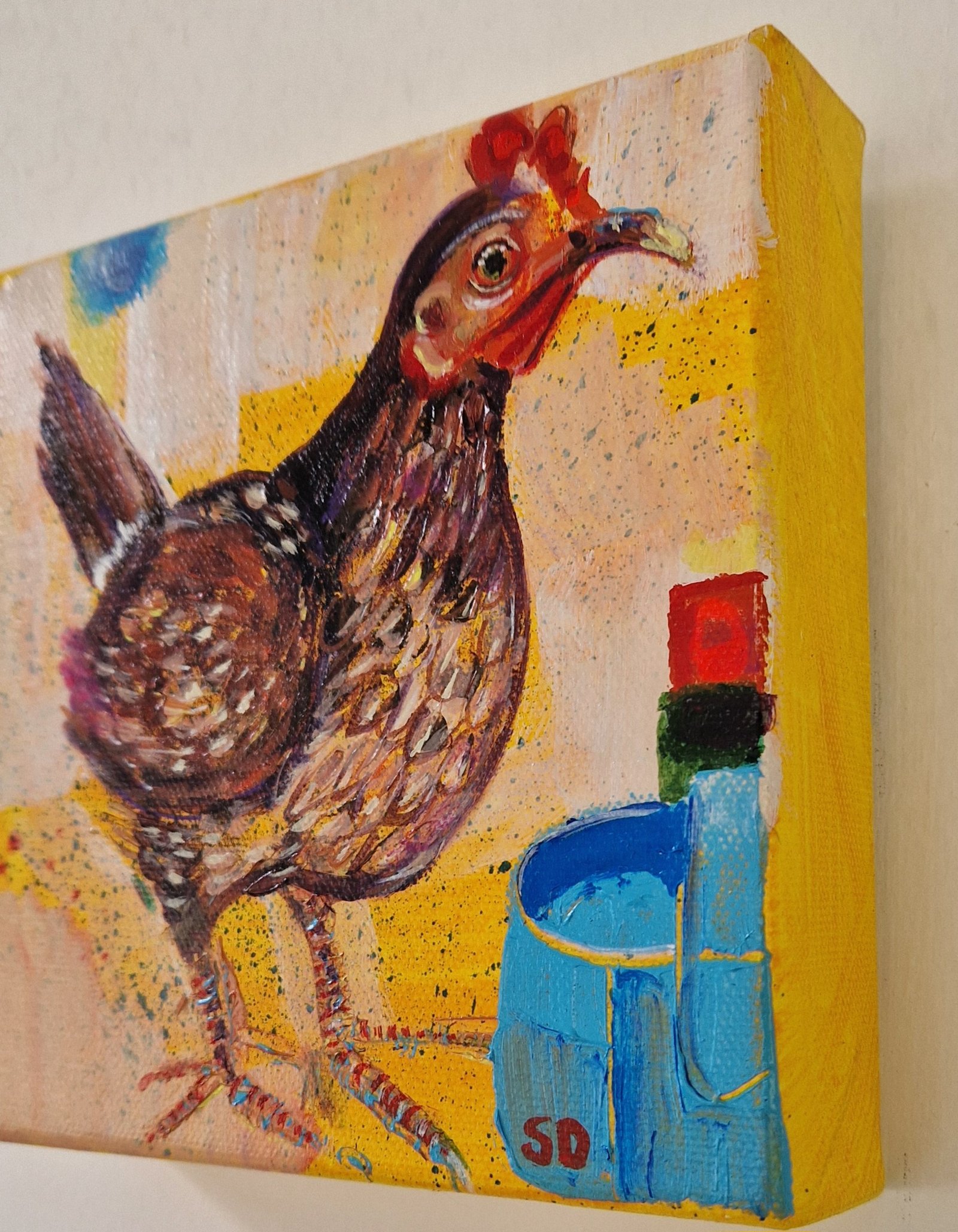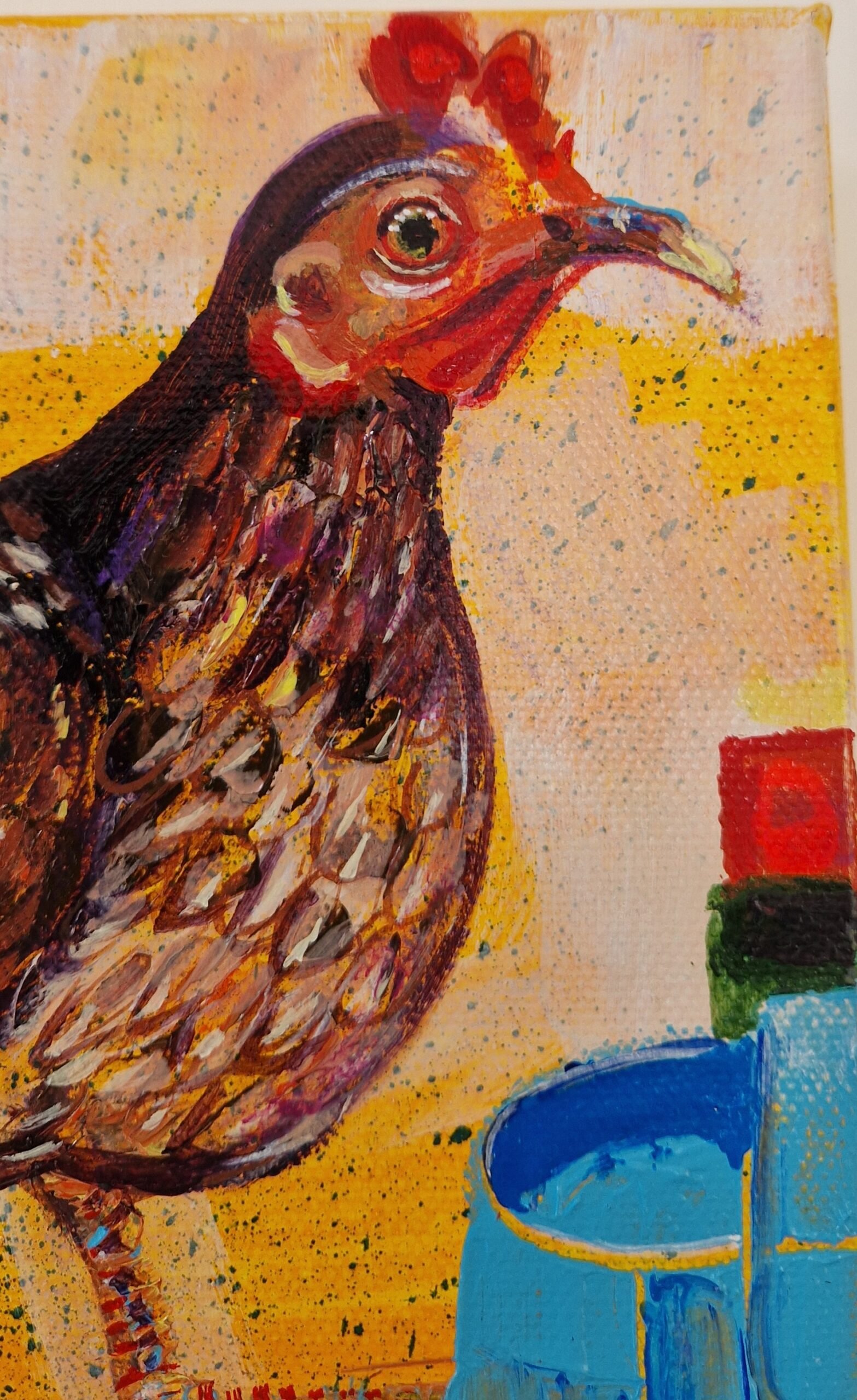 A contemporary, bright painting of a funky chicken, in bright colours by Sue Dewhurst. Loud and proud her name comes from a customer who won an online contest to name her.