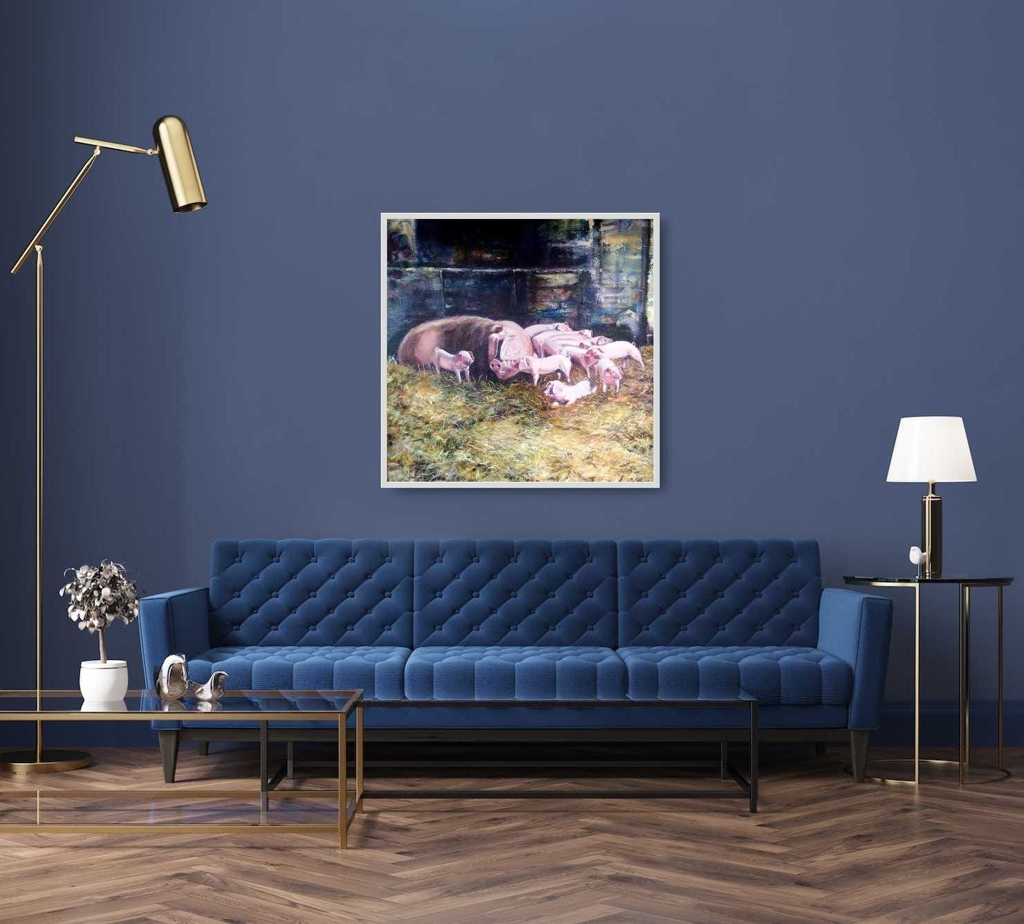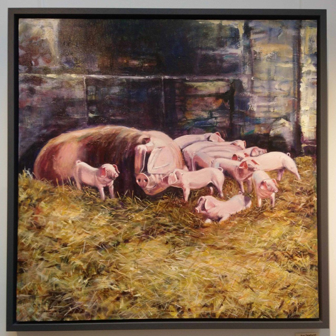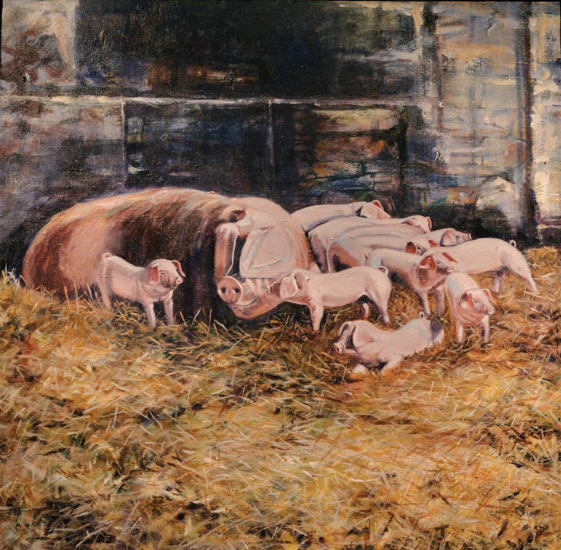 Teifi’s Pigs was an honour to paint. I was allowed access to Teifi Evan’s farm as an artist in residence and got a call to say ‘come now the light is perfect’ the proud sow was so happy showing off her piglets. These are pure Welsh breed pigs, of which Teifi Evans has a long line going back generations and for which he has won many awards. There was an amazing atmosphere in the barn the pigs were quiet, content and enjoying life. We were whispering so as not to disturb.